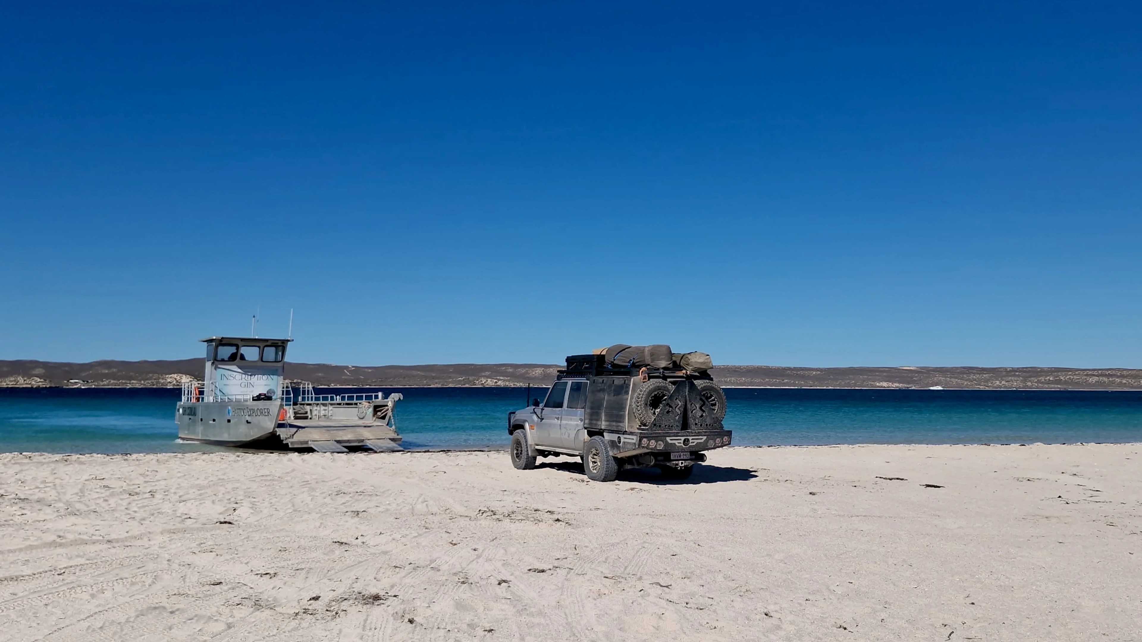 Before sunrise, we prepare the vehicles for the barge transfer across South Passage to Dirk Hartog Island. Loading the Land Cruisers onto the barge and reversing onto the island's sandy beach is an experience in itself and a hands-on start to the next stage of the journey. The crossing offers a chance to take in the marine life that defines this coast. Depending on the season, it's common to see dugongs, rays, turtles, dolphins, and occasionally whales in the clear shallows. Once on the island, we drive to the Dirk Hartog Island Homestead, home to the Wardle family, custodians of the island for three generations. A stop at The Inscription bar, known as Australia's most remote bar and café, offers time for a coffee and a look around before the convoy continues north. By afternoon, we reach our first island campsite – a quiet stretch of beach with sand dunes and uninterrupted ocean views. Swags are set up on the sand, and the evening is yours to settle into the rhythm of island life.